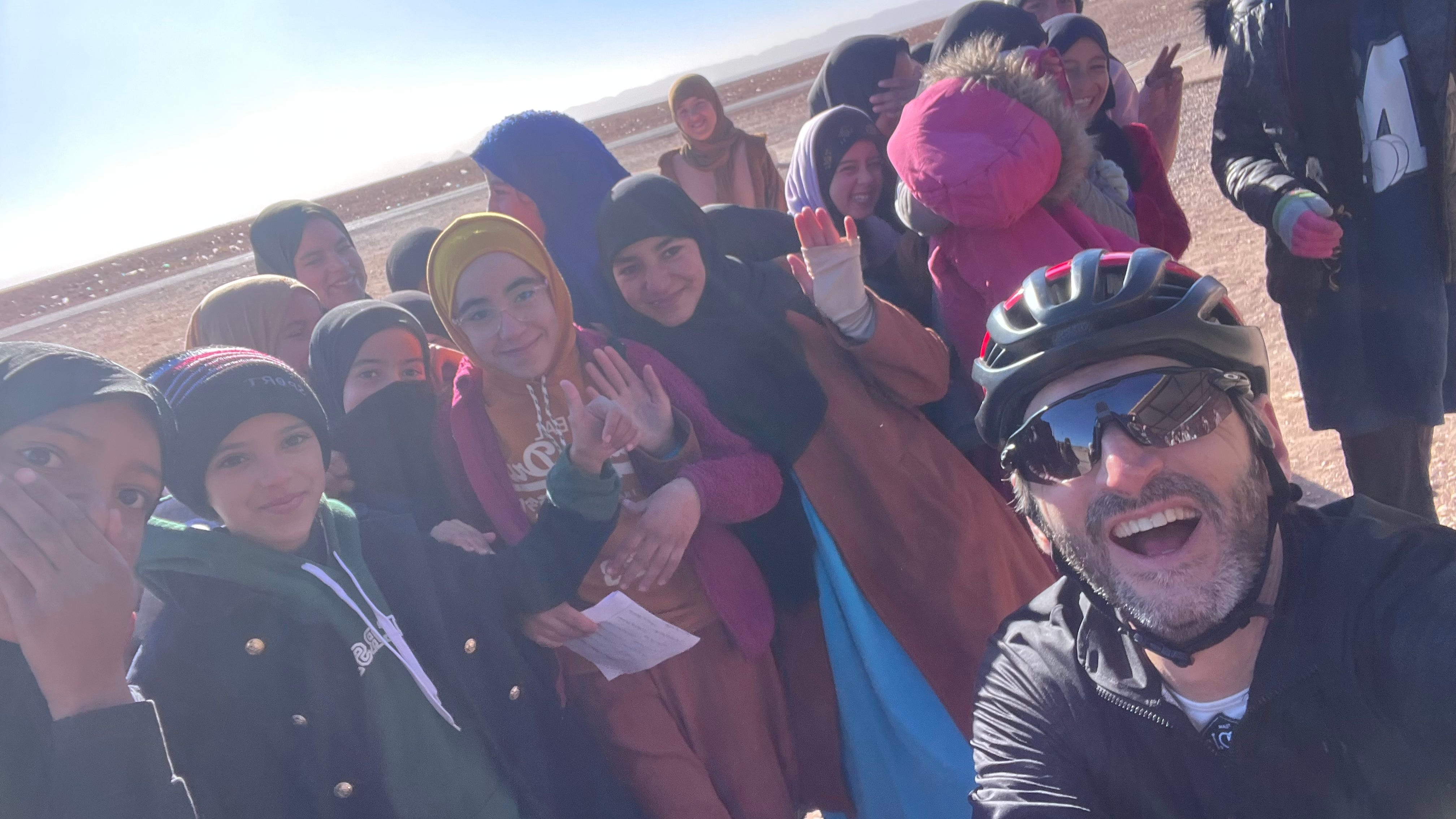 Rimango solo in testa e, dopo un’oretta di stancante pedalata, vedo dal navigatore che, fra qualche centinaio di metri, dovremo prendere uno svincolo a sinistra, sicuramente l’inizio della strada sterrata. Si trova in un piccolo paesino chiamato Ouisselsate. Appena ne varco la soglia, vedo alla destra la scuola e tanti bambini che aspettano fuori. Mi ci avvicino e mi fermo sotto il portico, per aspettare i miei compagni e riposare dopo questa fatica iniziale.