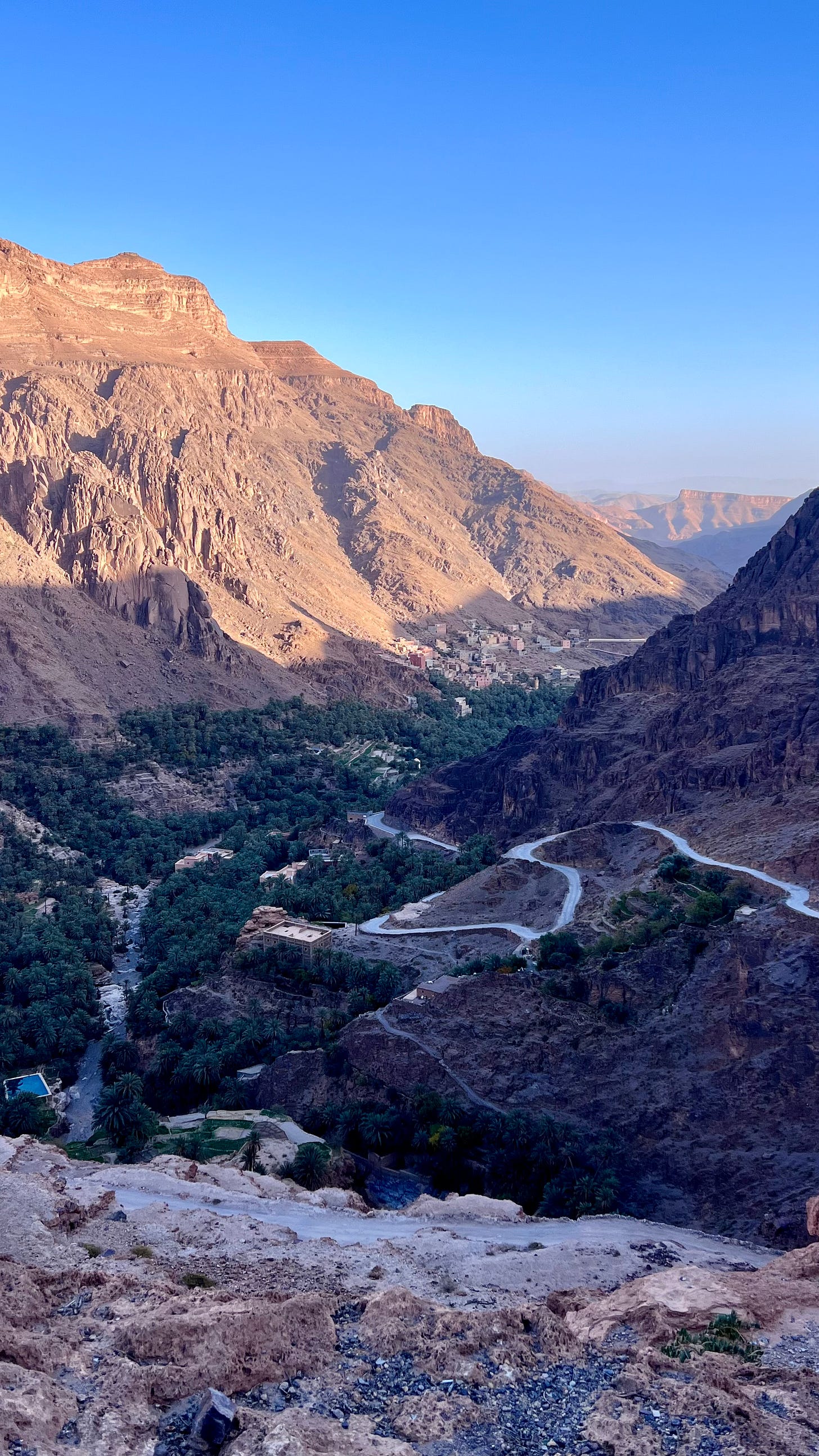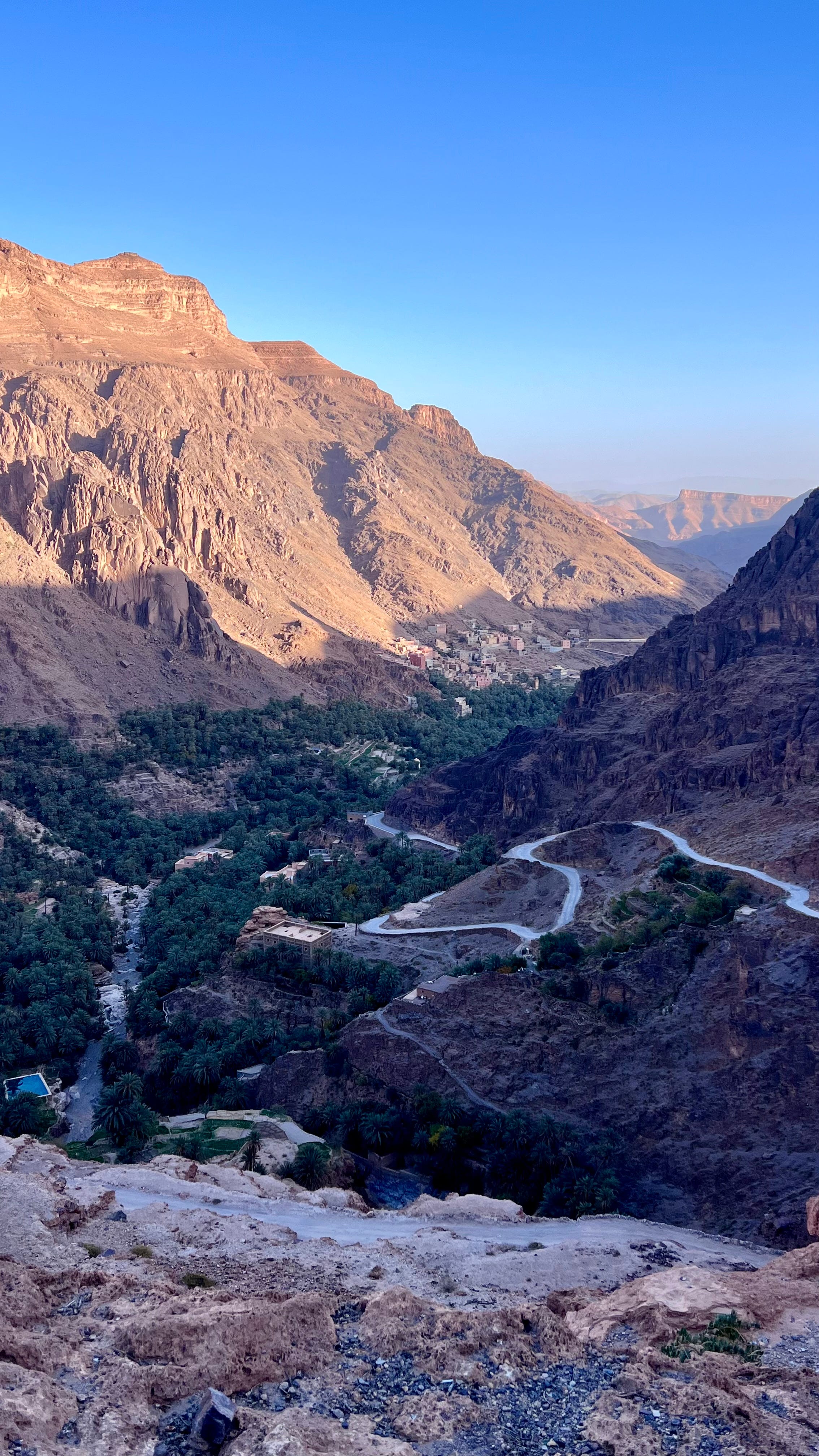 Quando siamo ormai ad appena tre chilometri dall’arrivo ci troviamo improvvisamente, dopo una curva, in un belvedere, una sorta di balcone naturale che ci lascia scoprire la bellezza incredibile di questa oasi che vediamo dall’alto, nella valle fra le due montagne. Una distesa enorme di palme e vegetazione che raggiungeremo dopo aver percorso l’ultimo tratto, una ripidissima strada non asfaltata bensì cementata, piena di tornanti chiusi su sé stessi.