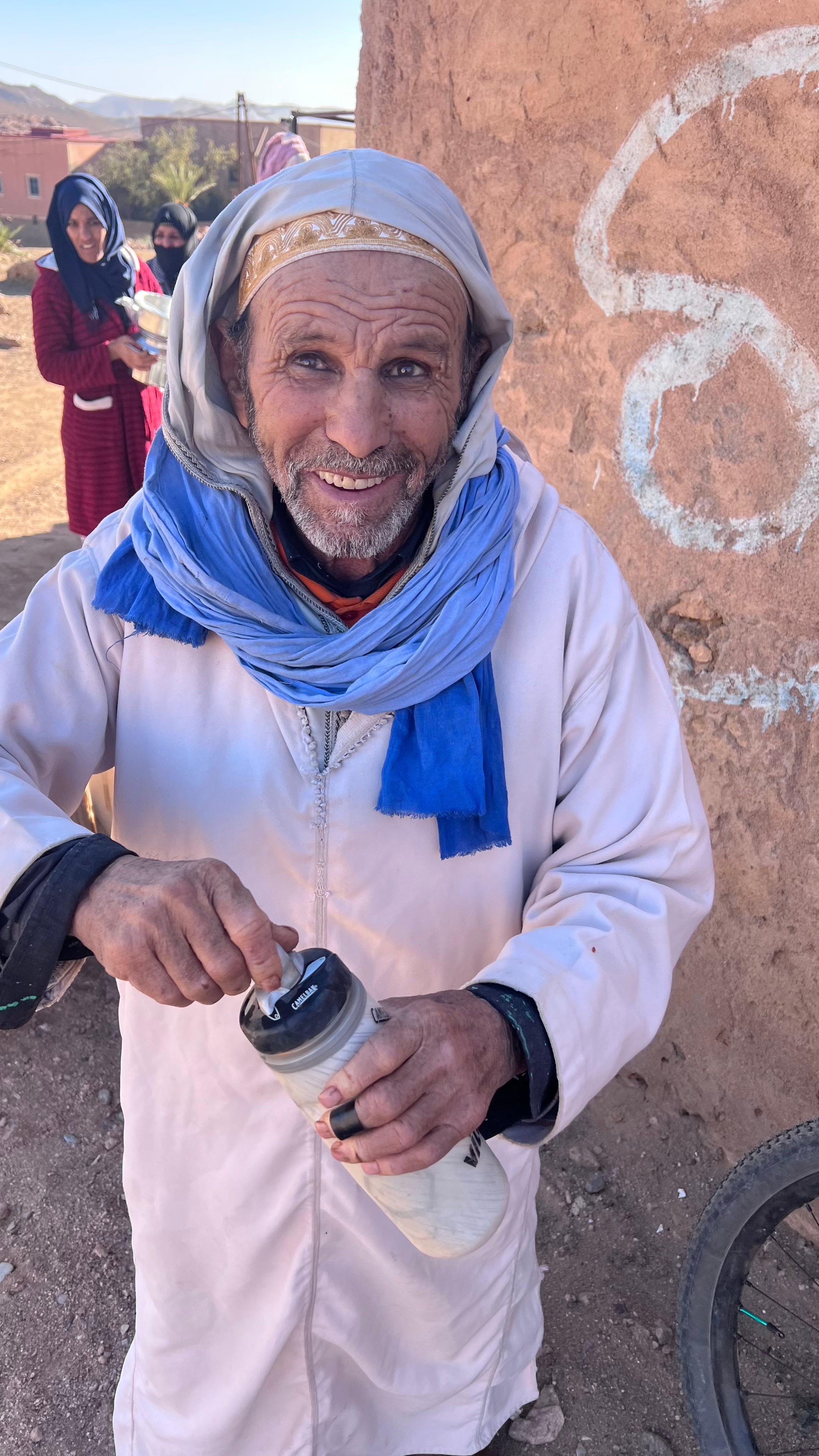 Mentre il figlio cerca di convincere le signore a comperare dei caftani, il vecchietto che ride in continuazione mi chiede se ho bisogno di qualcosa. In effetti, avrei finito l’acqua. Gli mostro la borraccia vuota e gli chiedo se posso comprare una bottiglia da qualche parte. Ma lui mi toglie la mia borraccia dalle mani senza chiedere e scompare. Una regola di buon senso consiglia di non accettare acqua di cui non si sa la provenienza e di preferire sempre quella imbottigliata. Dubito se fermarlo ma non lo faccio, mi sembra scortese. Torna dopo un po’ con la borraccia piena di acqua fredda e io gli chiedo quanto gli devo. Mi risponde con un gesto quasi offeso: non devo pagargli nulla. Ho sete e lui ha dell’acqua.