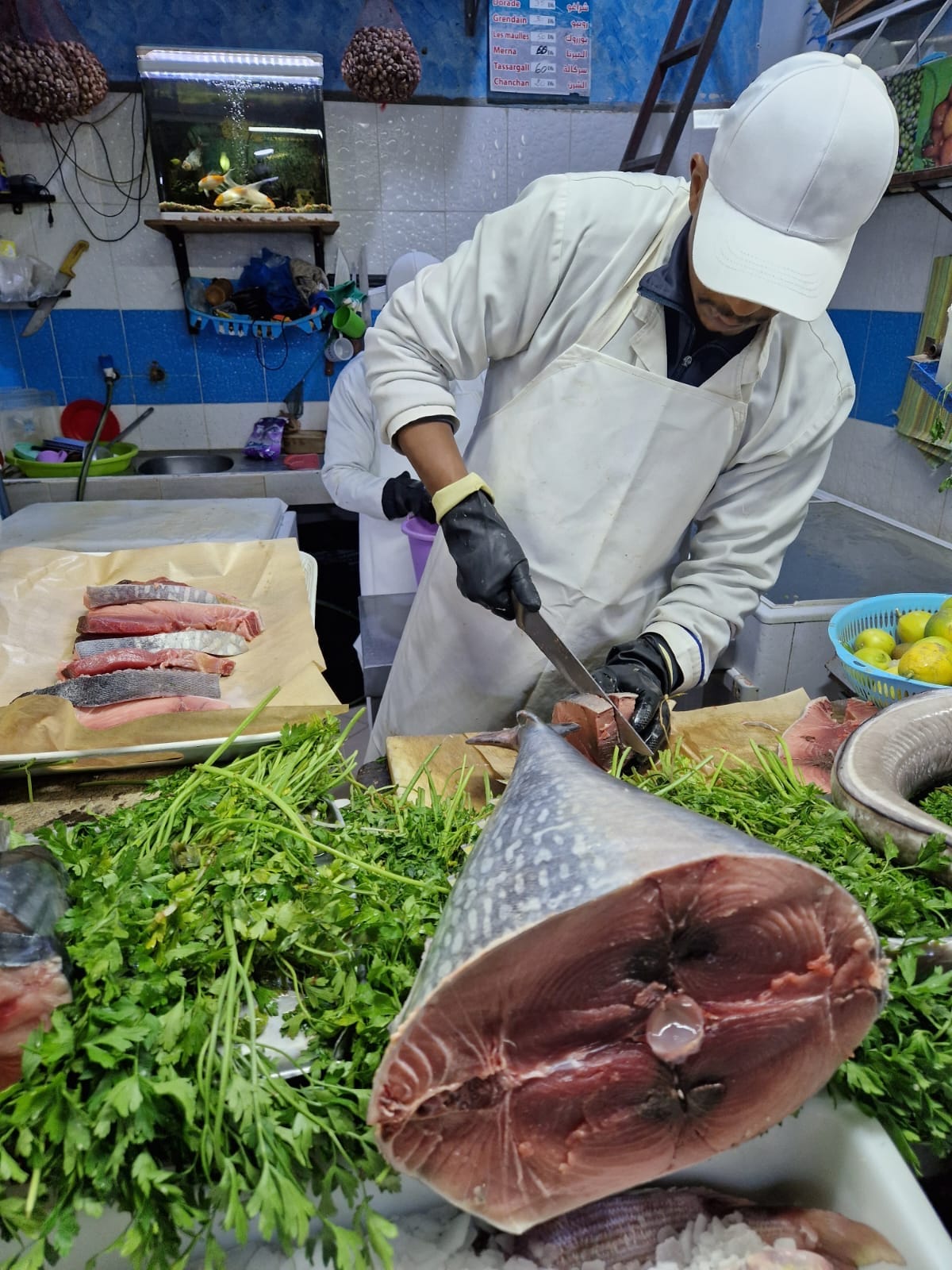 Ma prima, io e M. andiamo da un pescivendolo e compriamo due grosse fette di tonno appena arrivato, che pesano più di 3 kg, e un po’ di sarde freschissime. Paghiamo per tutto quel pesce quello che avremmo pagato in un ristorante italiano per un piatto.