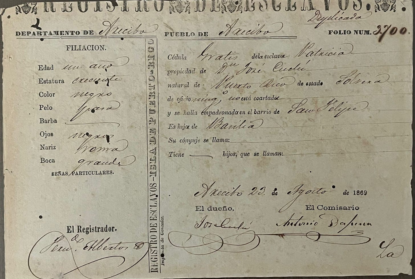Patricia era figlia di Basilia. Sul documento, che certifica che Don José Cuclú è il legale proprietario di Patricia, né la mamma né la figlia sembrano avere un cognome, come non ce l’hanno (almeno per ora, ma non escludo che presto non succederà) i nostri animali domestici. Solo il nome con cui immagino Don José si riferisse a loro.